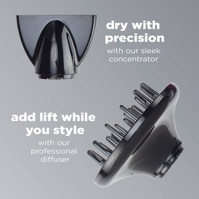 Less frizz. Pro performance. Up to 50% faster drying.* Get it all with the Quick Styling Salon Dryer from InfinitiPRO by Conair.® As the #1 selling dryer** with thousands of consumer reviews,† this styling essential is your go-to for salon results at home. Get incredible volume with powerful airflow from roots to tips with a professional AC motor that lasts up to 3x longer.* Want smooth, shiny hair? Ionic technology gets it done, with up to 75% less frizz.‡ You'll dry faster with less damage because ceramic technology protects your hair with gentle infrared heat. Choose from 3 heat and 2 speed settings to get your look just right with the perfect speed and heat for your hair type. To dry with precision, attach the sleek concentrator. Prefer more lift as you style? Attach the professional diffuser. The handle is designed to fit comfortably in your hand and make styling extra easy and comfortable. Once you've got your ideal look, lock it in with the true cold shot. Salon performance made easy! The Quick Styling Salon Dryer spares you the trip to the salon with professional technology that's simple to use. Fast drying for root-to-tip volumizing is a major time-saver. And the combination of Ceramic Technology and Ionic Technology reduces heat damage, frizz, and flyaways. You get beautiful, frizz-free body for a silky, shiny, healthy-looking finish. No wonder this is the #1 selling dryer** with thousands of reviews.† Be sure to use the diffuser for maximum volume or the concentrator to focus airflow for straight styles. The filter is removable, so you can remove the lint buildup and keep the dryer working like it should. Lose the lint to maximize performance and extend the life of the motor. Dry like a pro—quickly and easily—with this versatile and powerful styling essential from InfinitiPRO by Conair. *When compared to other Conair® DC motor hair dryer and styler models. **The enclosed hair dryer is the #1 selling dryer among pistol-grip hair dryers sold in the US, based on IRI Scan Data for dollar sales from 6/28/20. †The enclosed hair dryer has thousands of reviews based on consumer reviews as of 7/15/20 from leading e-commerce retailers. ‡When compared to hair dryers with natural ion generation.