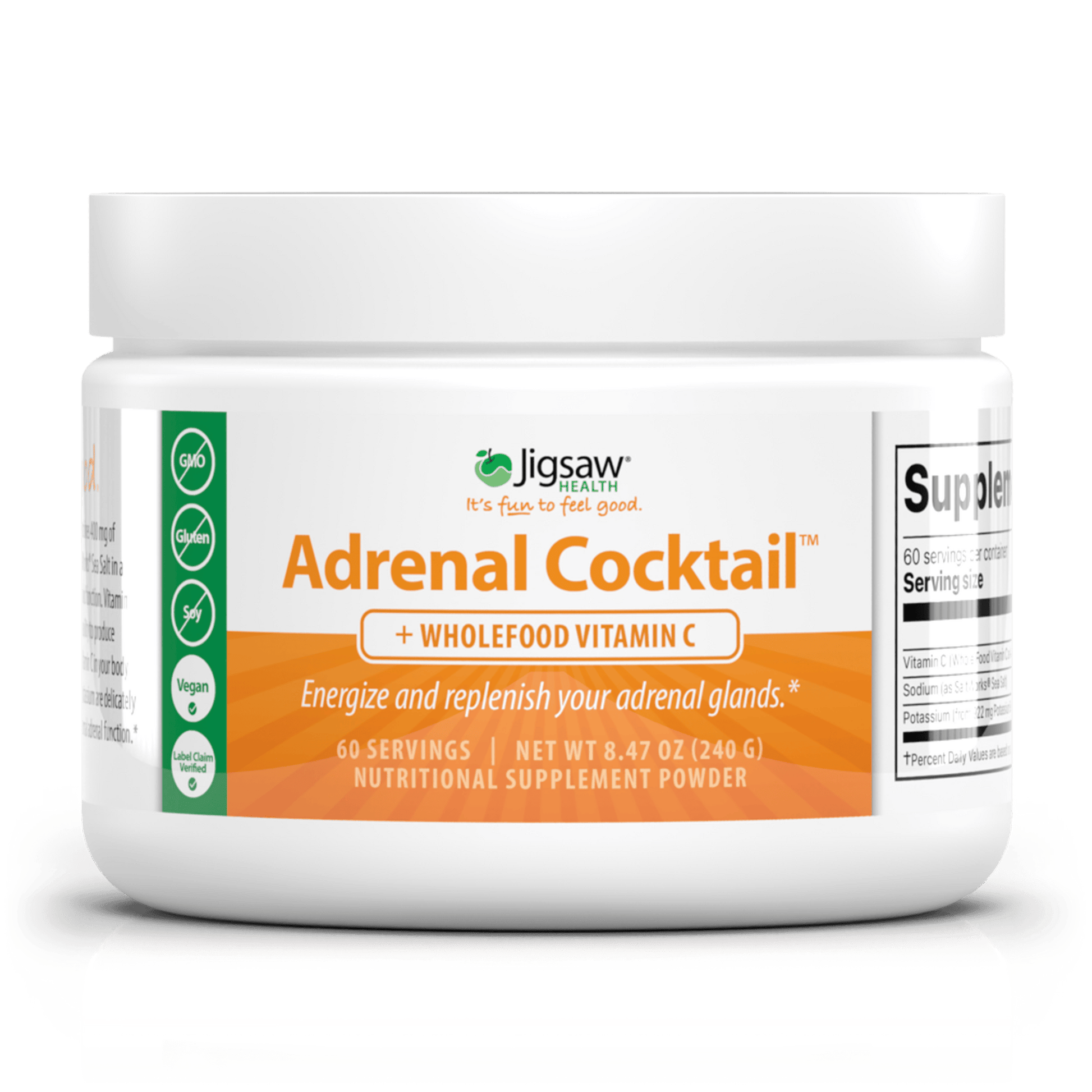 Jigsaw Adrenal Cocktail™ + Wholefood Vitamin C is a unique combination of 3 simple, yet powerful ingredients -- Potassium Bicarbonate, SaltWorks® Sea Salt, and Acerola Cherry Extra. Promotes adrenal health to support a balanced response to stress, support energy production, reduce leg cramps, and reduce bloating.*